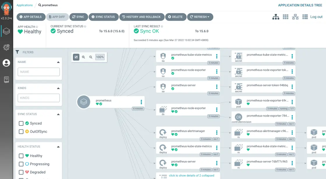 Anwendungen können mit Git hinzugefügt, aktualisiert oder entfernt werden. Als Beispiel haben wir Prometheus in unserem Cluster installiert.