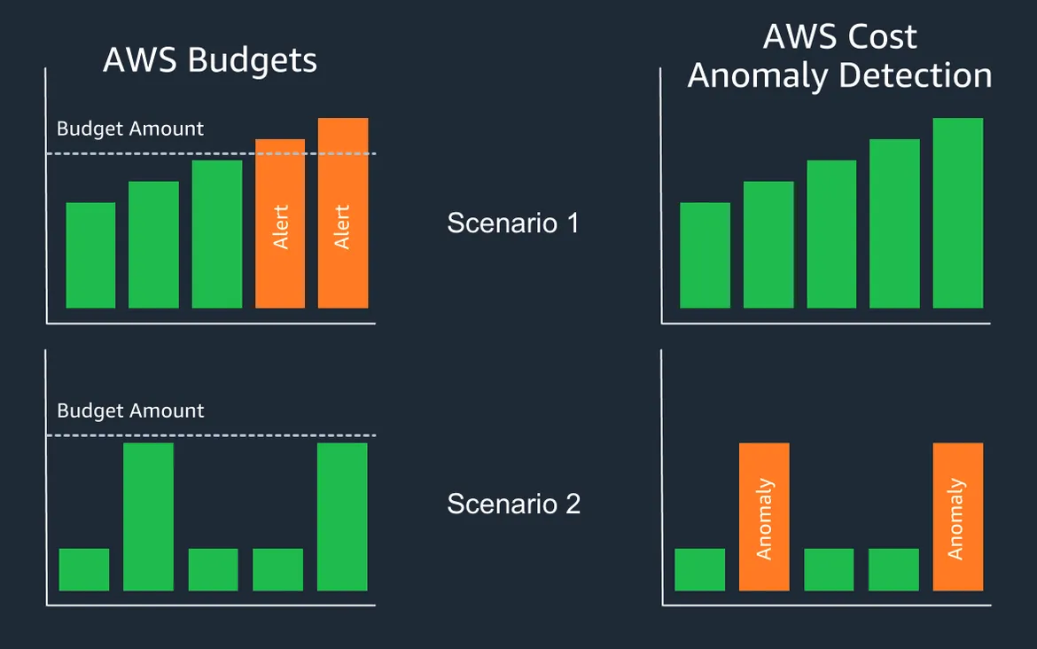 AWS Budgets und AWS Cost Anomaly Detection helfen dabei, kostspielige Service-Nutzungen frühzeitig zu erkennen und Maßnahmen zu ergreifen, um unerwartete Kosten zu vermeiden.
